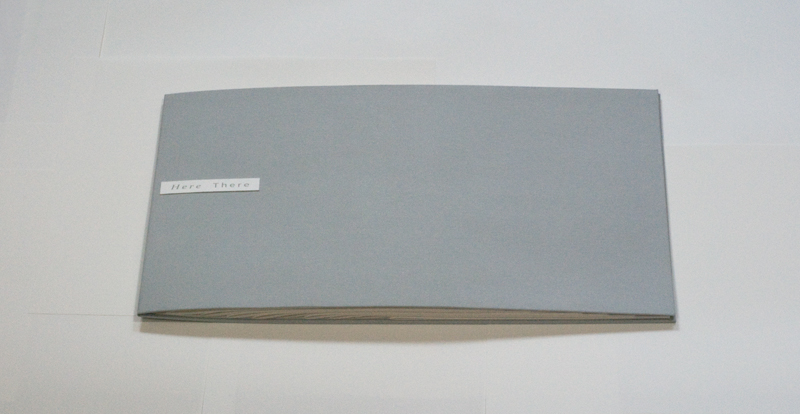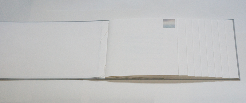 Closed, the book resembles the silhouette of an airplane wing. Its 9 signatures are spaced apart, reflecting the pauses in the characters’ thoughts, while the structure challenges the viewer’s position when leafing through the 73 pages. Its emotional text, in English to emphasize cultural ambiguity, gives voice to two unidentified individuals in transit. The telling of the story starts in an airport but mainly takes place onboard a plane. The text is regularly interrupted by a parallel visual narrative told through colour photographs of the sky and black-and-white travel pictures and pages from vintage travel albums of the late forties and early fifties.